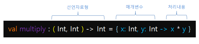 익명함수로 쓰려면 당연히 이름없이 매개변수와 처리내용만 있겠다. { x, y -> x*y } 처럼.
