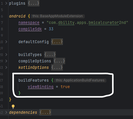 module수준의 grade build script의 android섹션? -> buildFeatures -> viewBinding = true 이렇게 하면 자동으로 뷰를 결합하는 클래스가 생성된다. 이때 activity이름이 MainActivity인 경우 ActivityMainBinding으로 생성된다. MainActivity에 사용할 수 있다. 아주 편하다.