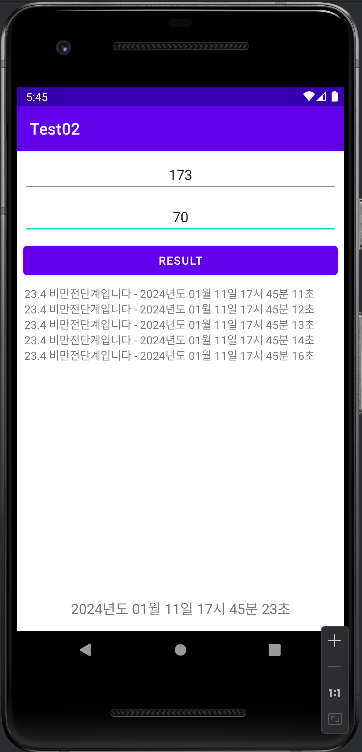 bmi >= 23 && bmi < 25 -> message = "비만전단계"