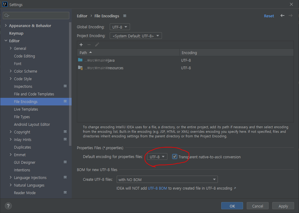 intellij의 setting에서 [ 그림 2 ]와 같이 Default encoding for properties files를 UTF-8로 선택하고, Transparent native-to-ascii conversion도 선택하고 적용하면 된다.