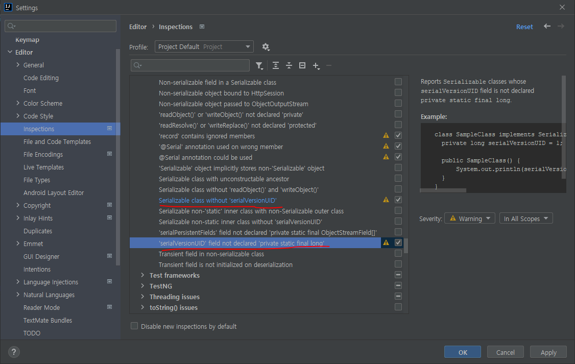 또는 GenerateSerialVersionUID plugin 설치해도 된다.