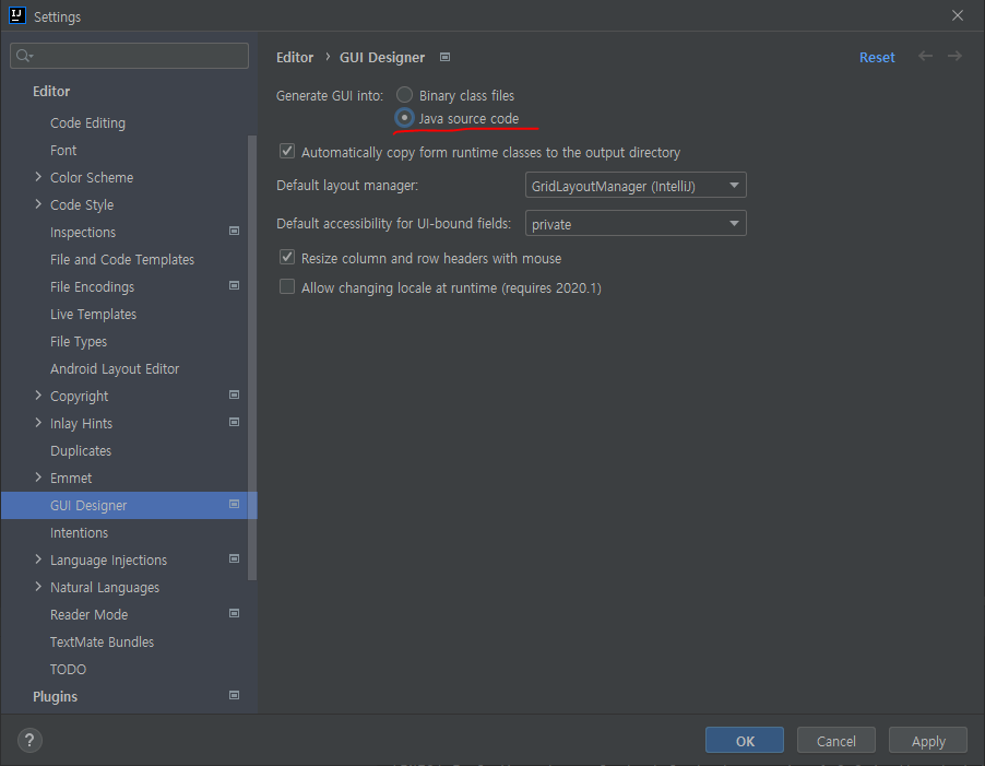일단 Settings -> Editor -> GUI Designer에서 다음과 같이 조치하고, IDE 재시작 후 정상 작동한다.
